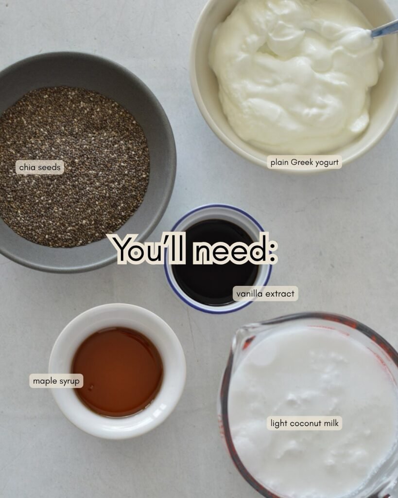 Here’s what you’ll need to make this chia pudding recipe coconut milk. Quantities are perfect for 2–3 servings: